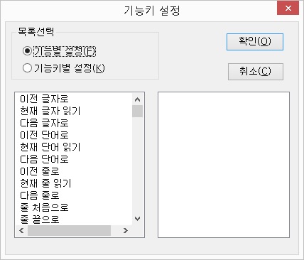 다만 상황에 맞는 메뉴 중 '기능키 설정'에서 엔터를 누르면 '기능키 설정' 대화상자가 나타나며 탭키를 한번 눌러 기능 목록으로 이동할 경우 검색 결과에서 찾았던 기능으로 바로 포커스가 됩니다.